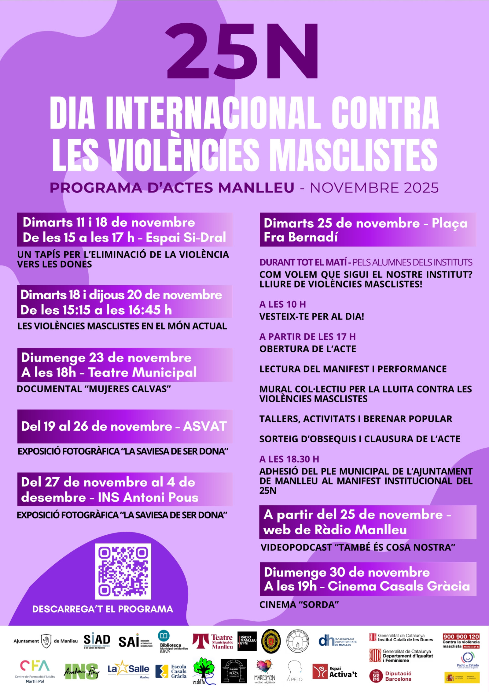 25N, Dia Internacional per a l’Erradicació de la Violència vers les Dones. Les propostes, diverses i per a totes les edats, són fruit del treball conjunt amb altres serveis de l’Ajuntament i amb diverses entitats i organitzacions del municipi.