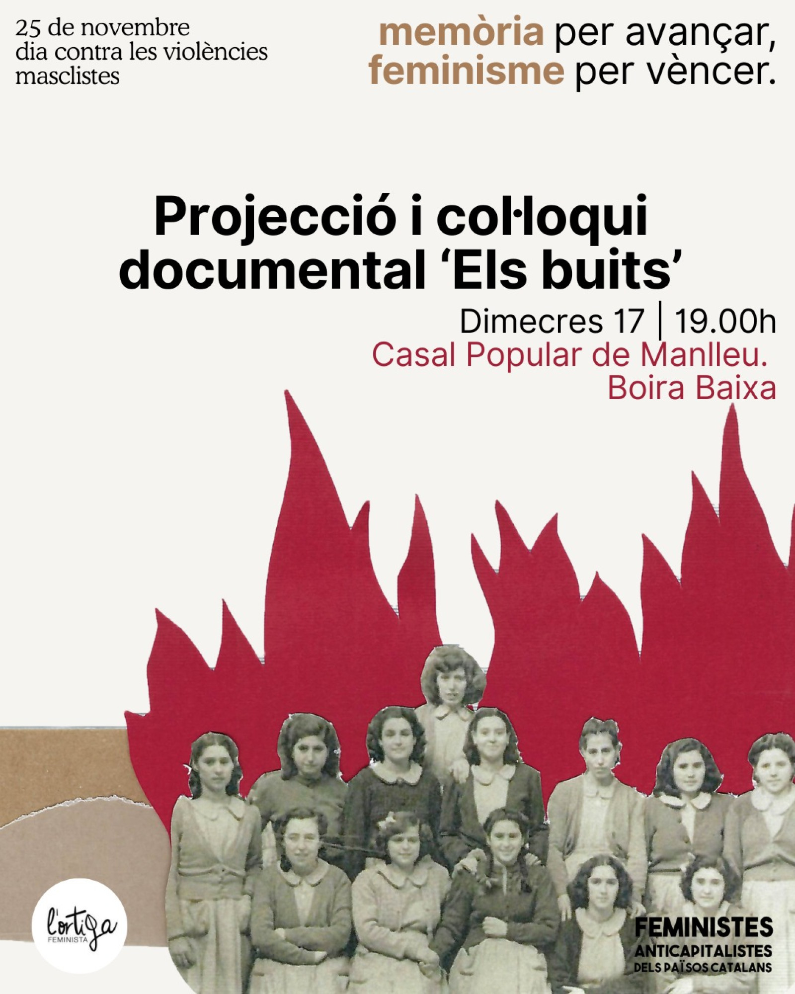 L'ortiga, col·lectiu feminista i anticapitalista osonenc, organitza al Boira Baixa la projecció del curtmetratge documental 'Els buits', en què Mariona Roca Tort reflexiona amb la seva filla, sobre el seu pas pel Patronato de Protección a la Mujer franquista.
