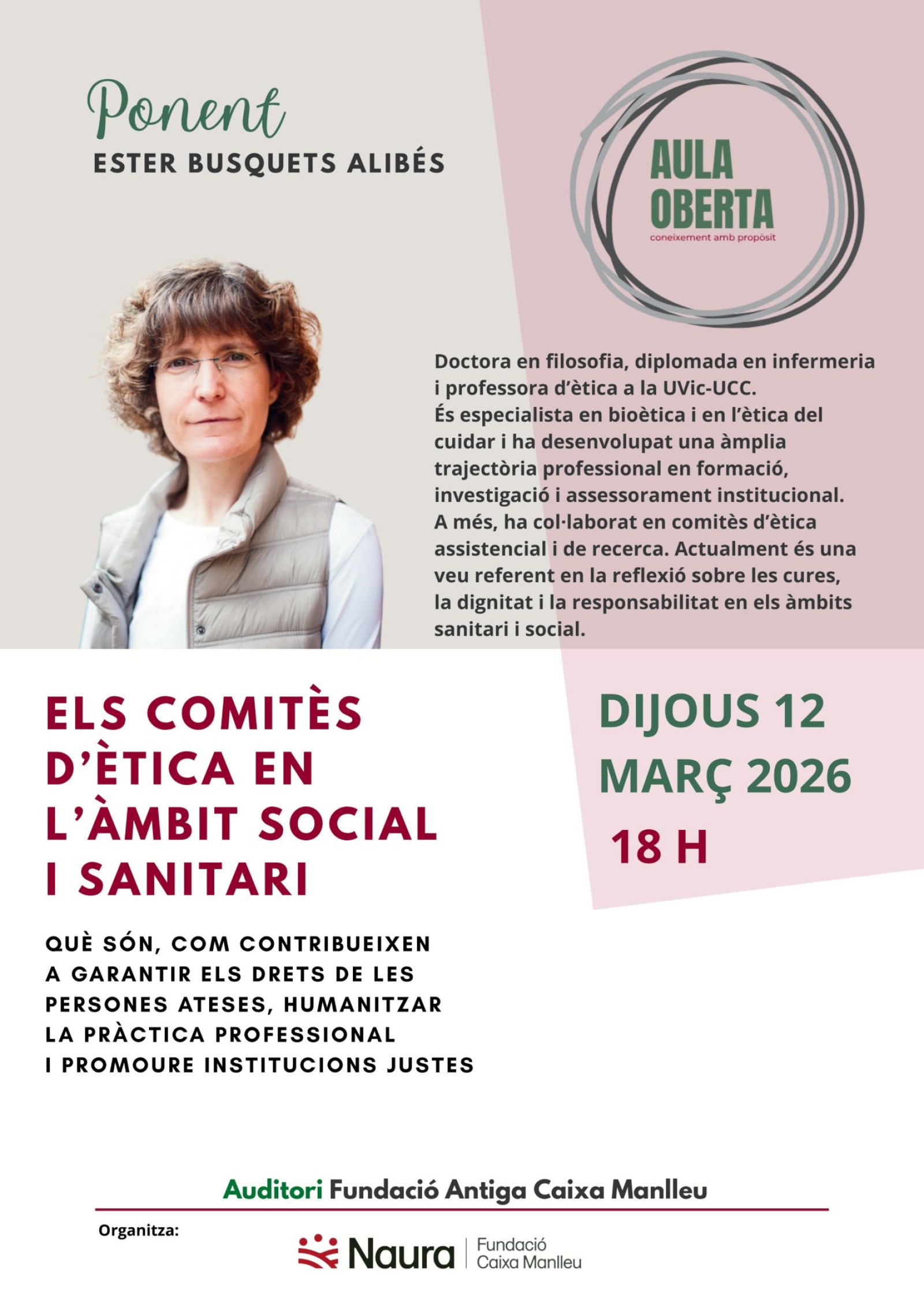 Naura-Fundació Caixa Manlleu ha organitzat una nova sessió del cicle d'Aula Oberta centrada en els comitès d'ètica en l'àmbit social i sanitari. Tindrà lloc a l'Auditori Fundació Antiga Caixa Manlleu el dijous 12 de març a les sis de la tarda.
