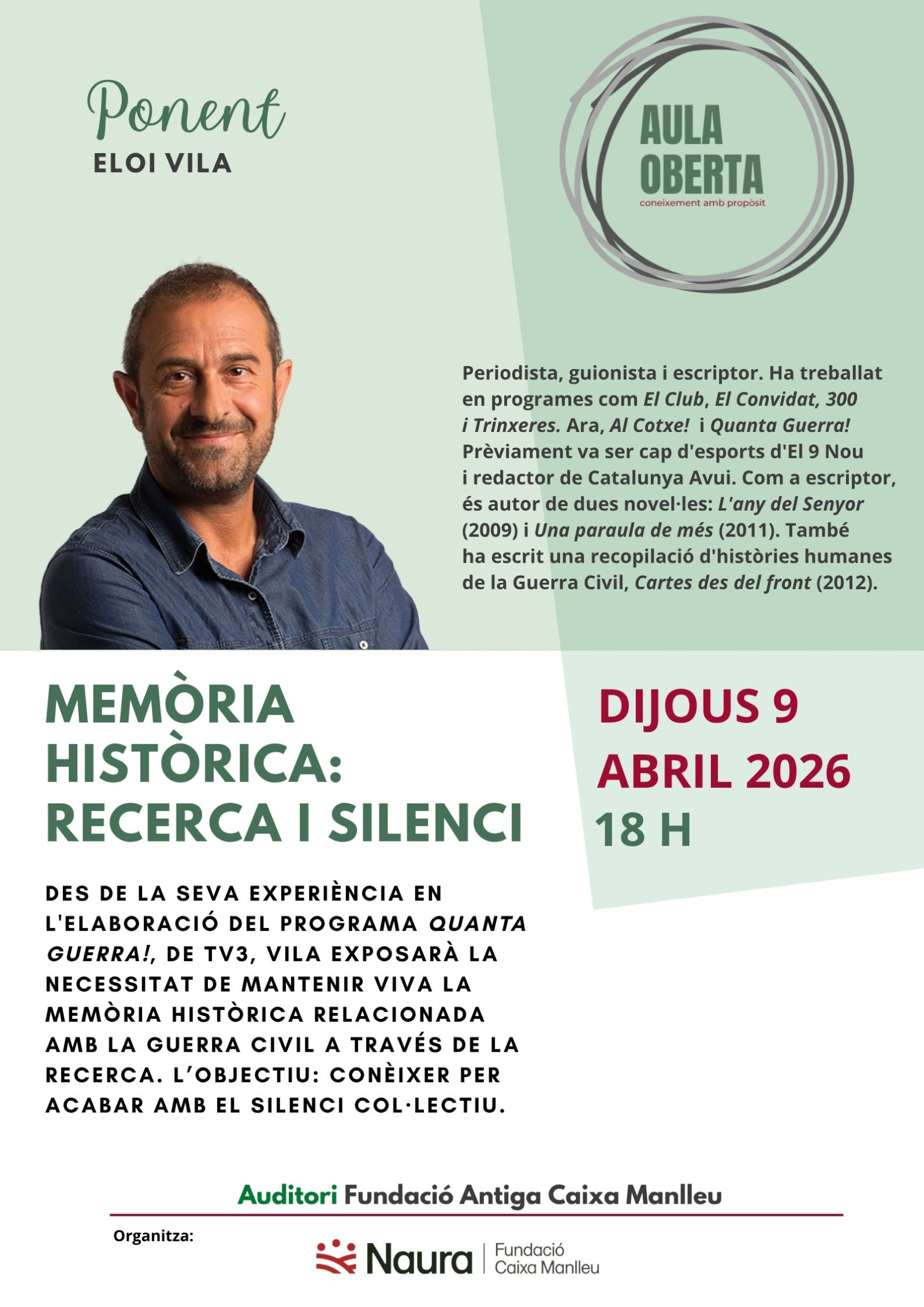 Quanta guerra, de TV3, Eloi Vila, conduirà la nova sessió d'Aula oberta organitzada per Naura-Fundació Caixa Manlleu. Tindrà lloc el dijous, 9 d'abril a les 18 h, a l'Auditori Fundació Antiga Caixa Manlleu.
