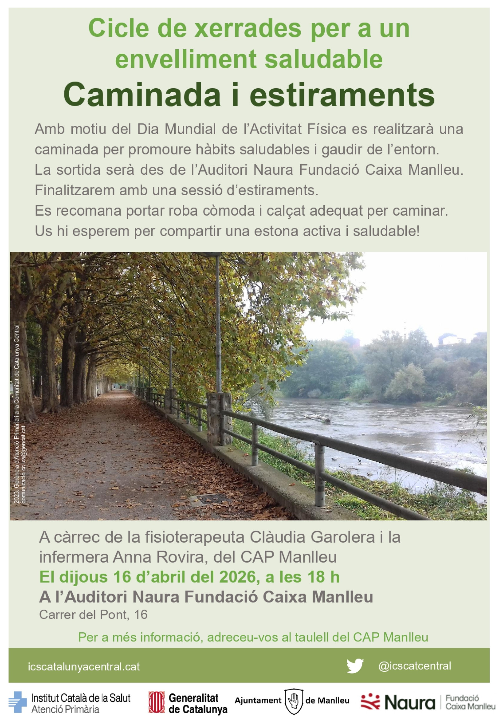 Amb motiu del Dia Mundial de l’Activitat Física s'ha programat una caminada que anirà seguida d'una sessió d'estiraments. L'activitat forma part del Cicle de xerrades per a un envelliment saludable.