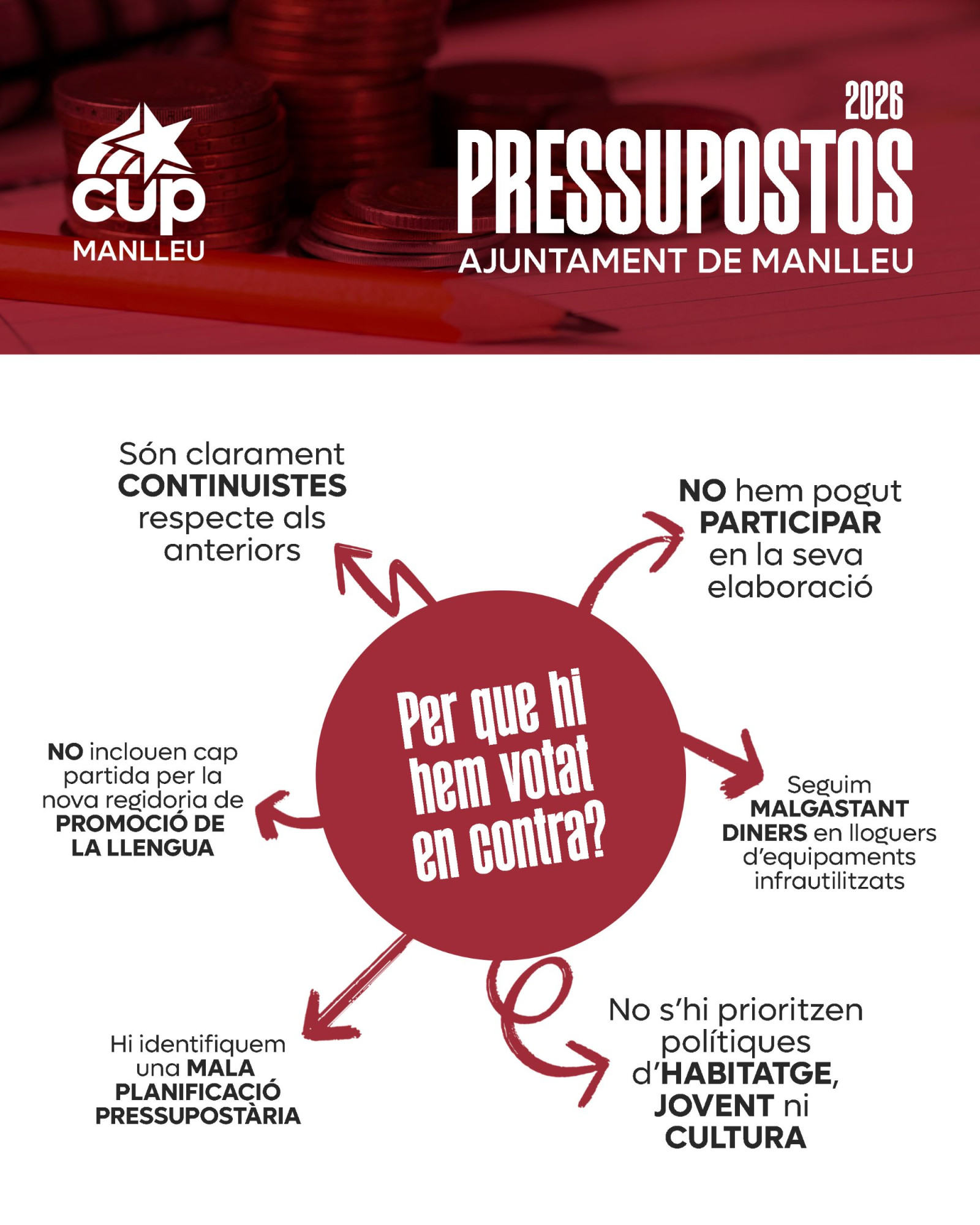 El grup polític de La CUP a Manlleu ha emès un comunicat per rebutjar el pressupost aprovat pel ple de l'Ajuntament. A continuació mostrem el text del comunicat: