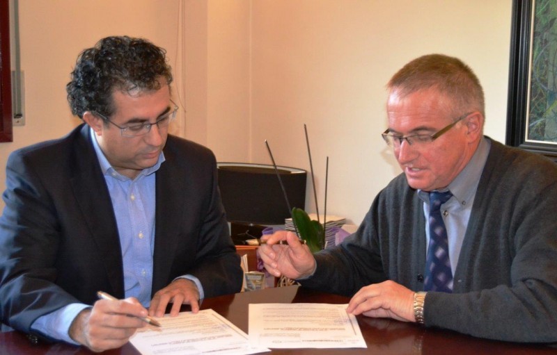 Signatura del conveni, Francesc Altarriba i Pere Prat (alcalde de Manlleu)