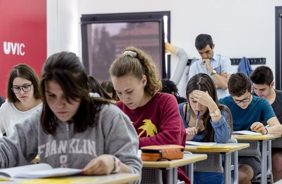 Els exàmens a la UVic, amb el professor de l'institut Antoni Pous Joan Mitjavila, de fons. Foto: Adrià Costa/Osona.com