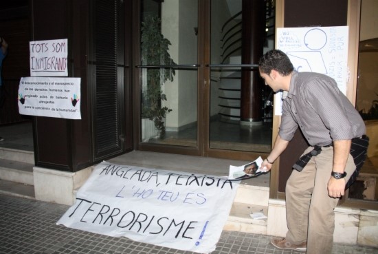 Un cop davant la porta d'entrada, els concentrats han continuat cridant contra el líder de Plataforma per Catalunya. Unes noies, acompanyades d'una nena que no tenia més de 10 anys, han enganxat els cartells i les pancartes contra el feixisme i Plataforma per Catalunya a la porta del domicili del líder de PxC.