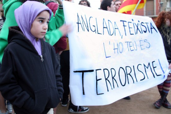 Els manifestants van cridar consignes com "Tots som de casa" o "Fora el feixista de la ciutat", en referència al líder de PxC, Josep Anglada. Després de gairebé una hora de concentració, els manifestants es van dirigir davant la casa de Josep Anglada per deixar-hi les pancartes.