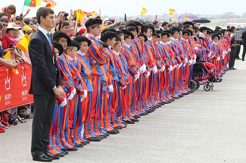 Joves vestits de guàrdia suïssa reben el Papa a l'aeroport. Foto: www.madrid2011.com