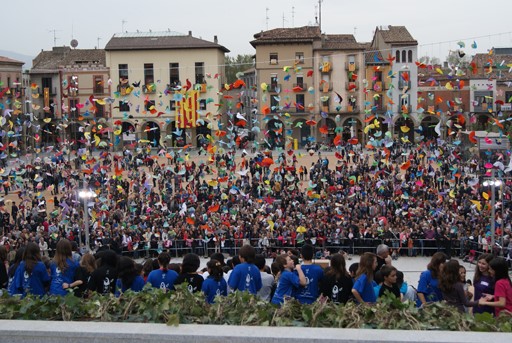 Més dun miler de nens i nenes de totes les escoles de primària de Manlleu van cantar des de les escales acompanyats de la Cobla de Sant Jordi-Ciutat de Barcelona, davant dunes 4.000 persones, entre pares, mares, avis, i altres familiars a més de gent de fora que omplien la plaça.