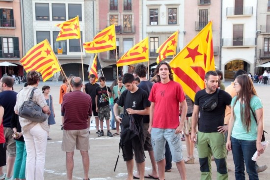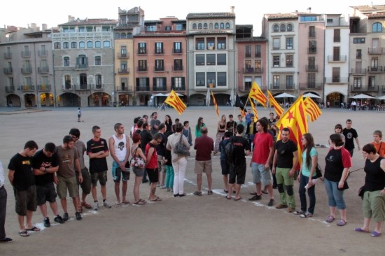 ACN - Una seixantena de persones s'ha concentrat aquest dimecres amb estelades a la Plaça Major de Vic a favor de la unitat de la llengua. L'acte, convocat per Maulets Osona, ha consistit en fer un llaç humà sota l'eslògan 'Enllacem-nos per la llengua, ni un pas enrere'.