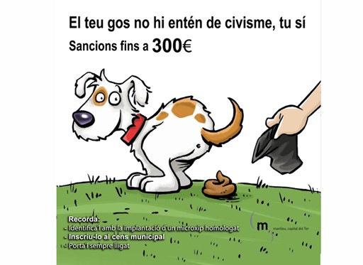 Manlleu inicia una campanya contra les actituds incíviques dalguns propietaris de gossos, en què destaca el fet que les sancions per no recollir els excrements de la via pública poden arribar fins als 300 euros. Així, sintensificarà laplicació de les sancions establertes ja fa temps a lOrdenança de Civisme municipal.