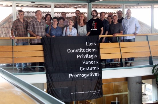 La banderes negres que penjaran els ajuntaments portaran la inscripció: lleis, constitucions, privilegis, honors, costums i prerrogatives. Un dels portaveus de la comissió, Xevi Rovira, ha explicat que els sis conceptes, extrets del Ban de la Junta de Braços, continuen essent "absolutament vigents i reivindicables", 300 anys després. Rovira ha avançat que la iniciativa de la bandera es vol estendre arreu del país de cara a la celebració de l'11 de setembre.