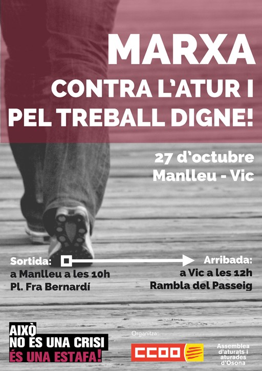 El proper diumenge 27 doctubre el sindicat Comissions Obreres d'Osona impulsa una Marxa contra latur i pel treball digne. La mobilització arrencarà des de la plaça Fra Bernadí de Manlleu a les 10 del matí i es farà el trajecte a peu fins a arribar al passeig de Vic al migdia.