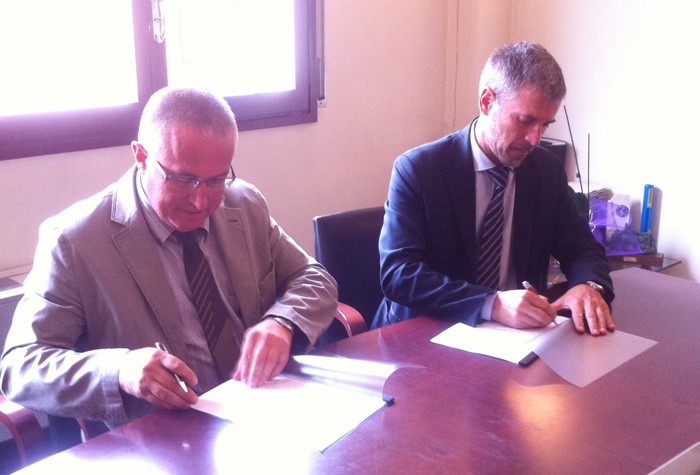 L'alcalde de Manlleu, Pere Prat, i el representant de Sorea signant el conveni