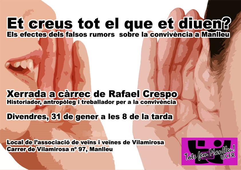 Aquest divendres 31 de gener a les 8 del vespre es farà una xerrada sobre els efectes dels falsos rumors sobre la convivència a Manlleu, que sanomena Et creus tot el que et diuen?. La xerrada la farà Rafael Crespo, historiador, antropòleg i treballador per a la convivència i tindrà lloc al local de lassociació de veïns de Vilamirosa, al carrer de Vilamirosa número 97.