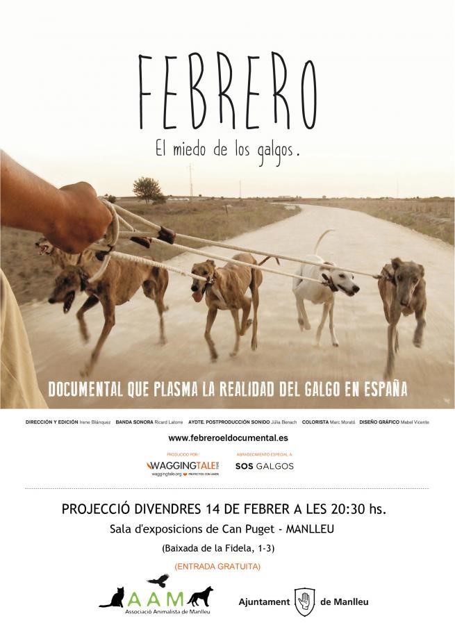 El proper divendres 14 sestrenarà a Manlleu el documental 'Febrero, el miedo de los galgos'. La producció dIrene Blánquez, és un retrat de la situació que viuen molts gossos llebrers a Espanya. La projecció es farà a 2/4 de 9 del vespre a la sala d'exposicions de Can Puget ". Lactivitat està organitzada per lAssociació Animalista de Manlleu.