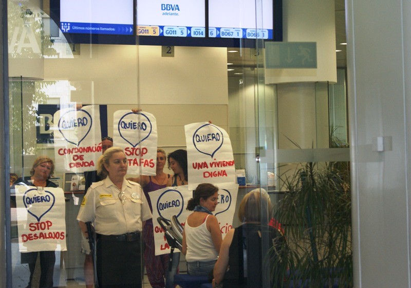 Una de les integrants de la PAH, Lamia, ha explicat que a lacció davui han elaborat pancartes aprofitant el mateix eslogan promocional del BBVA per completar-lo "de manera reivindicativa".