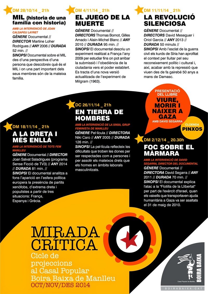 Aquest dimarts van començar les projeccions del cicle La Mirada Crítica al Casal Boira Baixa de Manlleu, que compta amb mitja dotzena de propostes durant aquest trimestre. El primer era el documental de Martina Loher Rodríguez sobre el Movimiento Ibérico de Liberación, el MIL, que va ser un grup armat antifranquista, conegut sobretot perquè nhavia estat integrant Salvador Puig Antich.