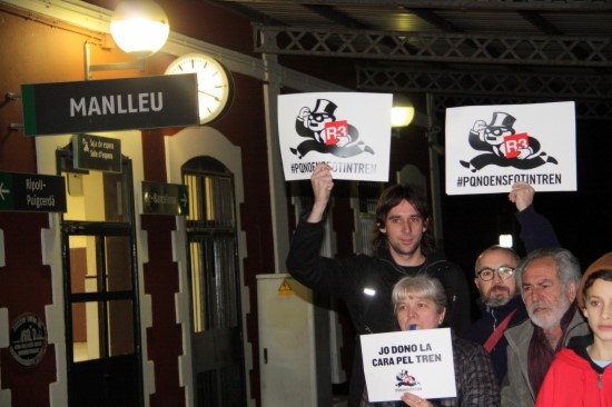 Una de les protestes del grup Perquè no ens fotin el tren a l'estació de Manlleu, pel gener del 2014