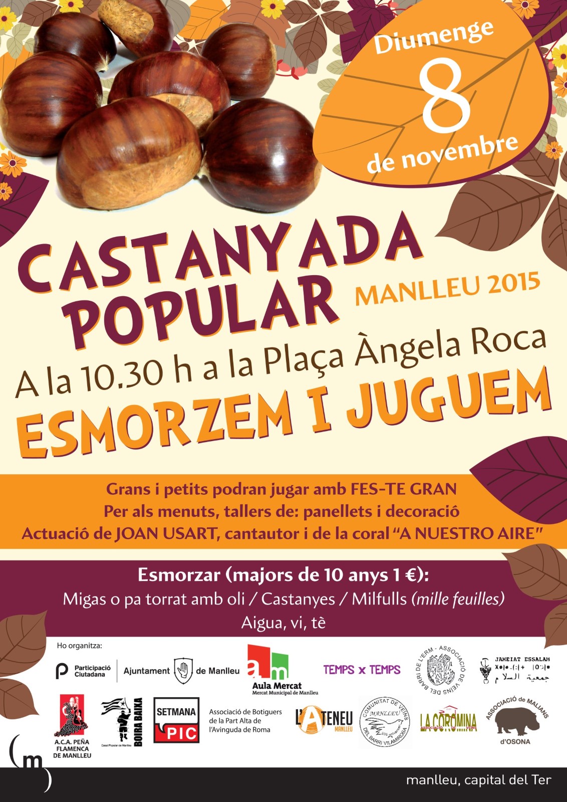A partir de 2/4 d’11 es farà un esmorzar amb castanyes, pa torrat amb oli, 'migas', milfulls, aigua, vi i te. A banda de l’apartat més gastronòmic hi haurà activitats i actuacions musicals. Pels menuts hi haurà tallers de panellets, a càrrec de L’Aula del Mercat Municipal, i participants del programa Temps x Temps faran un taller de decoració del parc. El cantautor Joan Usart i la coral de l’ACA Penya Flamenca de Manlleu A Nuestro Aire, amenitzaran l’esmorzar.