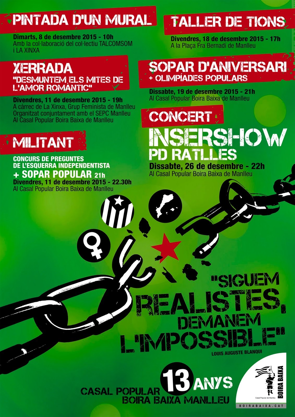 Un dels seus integrants, Aleix Rifà, ha explicat que s’han començat els actes del 13è aniversari durant el pont, amb un mural a favor de la diversitat sexual "que s'ha pintat al barri de l'Erm". Es continuarà aquest divendres 11 amb diverses propostes, entre les quals una xerrada que es titula Desmuntem els mites de l’amor romàtic, en col·laboració amb el grup feminista La Xinxa. Aquest divendres al vespre també es farà el Militant, “un concurs divertit, de preguntes de l’esquerra independentista, combinat amb proves”, que “ja és el quart any que el fem”, i abans “es farà un sopar”.