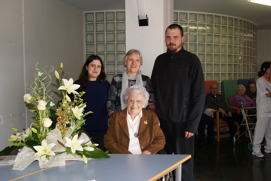 La residència Aura de Manlleu va celebrar aquest dimecres al matí un acte perquè la seva resident de més edat, Maria Dolors Porqueras, complia 101 anys. La regidora de Gent Gran, Carme Trillas, li va fer entrega d’un ram. Nascuda a Montreal (al Canadà), Maria Dolors Porqueras va arribar a Catalunya a l’edat de 4 anys.