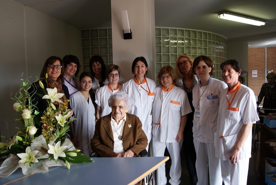 Part de l'equip de la residència Aura i la regidora de Gent Gran, Carme Trillas, amb l'homenatjada