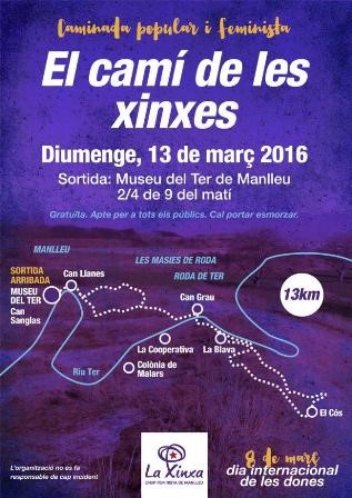 La Xinxa, Grup Feminista de Manlleu, ha organitzat aquest diumenge una caminada popular pel Camí de les Xinxes on les seves membres explicaran el motiu per què se l'anomena d'aquesta manera. El lloc de trobada és al museu del Ter de Manlleu a 2/4 de 9 del matí.