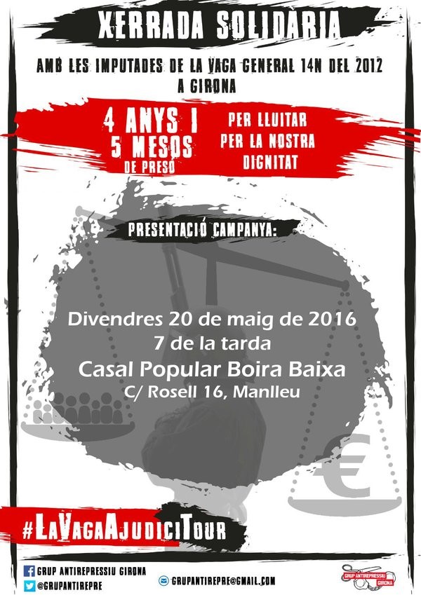El Casal Popular Boira Baixa de Manlleu organitza avui a les 7 de la tarda una xerrada solidària sobre els imputats de la vaga general del 14N del 2012 a Girona.