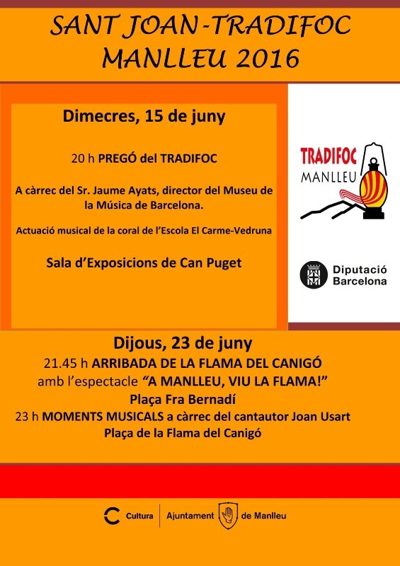 La revetlla del 23 serà la gran jornada del Tradifoc. A ¾ de 10 de la nit arribarà la flama del Canigó, que ve del Coll d’Ares i entrarà pel nord de Manlleu. Seguirà el mateix recorregut que l’any passat pels carrers de la ciutat i respectarà el canvi del carrer del Pont en lloc del de la Font perquè va tenir més bona acollida.
