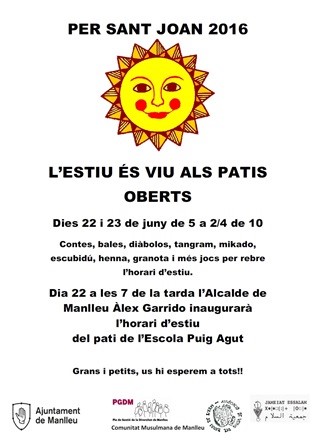 Per celebrar l’inici d’estiu el mateix dimecres 22 de juny i també dijous 23 s'han organitzat activitats al pati com ara, s’explicaran contes, es podrà jugar al diàbolo, pintar-se amb henna, construir figures amb el tangram i jugar a punteria amb les bales de 5 de la tarda a 2/4 de 10 del vespre. Aquestes activitats estan organitzades per membres de l’Associació de Veïns del Barri de l’Erm,de l’Associació Jameiat Essalam, la Comunitat Musulmana de Manlleu i els monitors del patis, que cada dia estan presents en aquest espai.