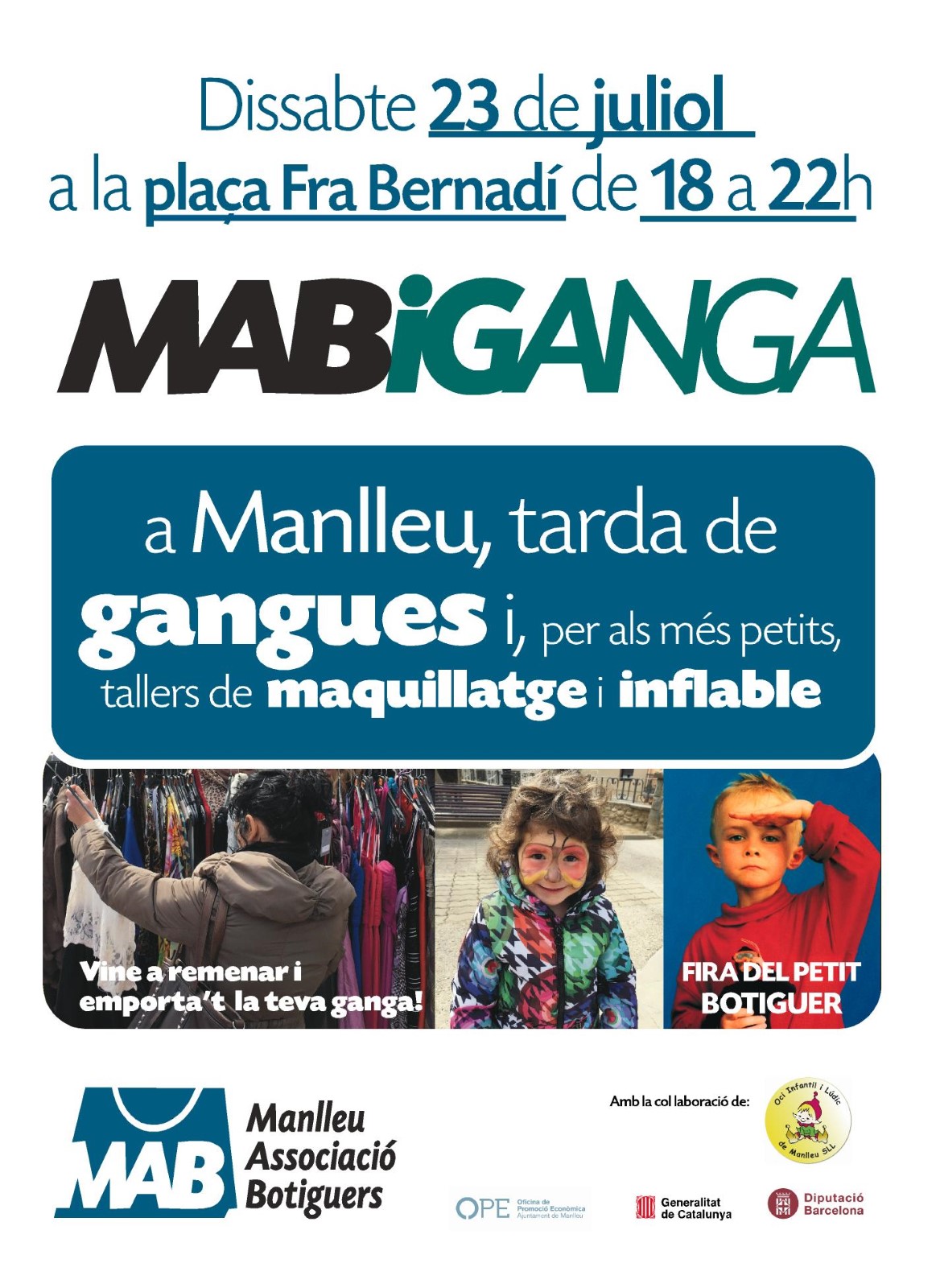Compte enrere per a la celebració de la Mabiganga a Manlleu dissabte de la setmana que ve, 23 de juliol. De 6 a 10 de la nit la Plaça Fra Bernadí es vestirà de gala per una fira on els comerços participants oferiran els productes a preus molt rebaixats. Simultàniament, es farà l'edició de la Fira del petit botiguer, un espai on els més petits podran vendre llibres, joguines i altres articles que ja no utilitzin.