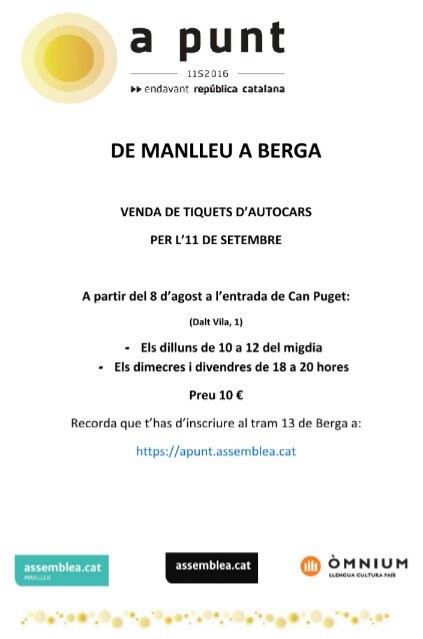 Els bitllets es poden comprar a Can Puget a un preu de 10 euros, els dilluns de 10 a 12 del migdia i els dimecres i els divendres de 6 a 8 de la tarda. Es preveu que a Berga s’hi reuneixin el proper 11 de setembre fins a 40.000 persones, pel que suposa un gran treball per part de l’organització. Cada una de les ciutats on s’hi farà una manifestació té assignada una República i en aquest cas, a Berga serà la de la cultura. S’hi faran activitats diverses com castells i també hi participaran, entre d’altres, tabalers o geganters. Els responsables i coordinadors de l’Assamblea tant a Osona com a Manlleu segueixen treballant per garantir una organització eficient pel que s’espera un desplaçament massiu a Berga, ciutat designada com a punt de trobada per a tots els osonencs el proper 11 de setembre per reclamar la República Catalana. Tots els osonencs que s’hi desplacin haurien d’estar inscrits al tram 13 i ho poden fer a través de la pàgina web de l’ANC.