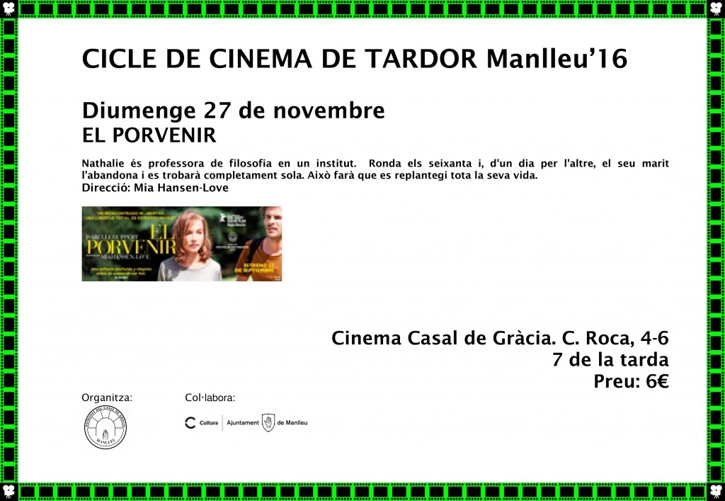Aquest diumenge 27 de novenbre es projectarà el film El porvenir de Mia Hansen-Love també dins del Cicle de Cinema de Tardor de Manlleu. La pel·lícula té com a protagonista a una professora d’institut de París que ha de replantejar-se la vida després que el seu marit la deixa per una altra.
