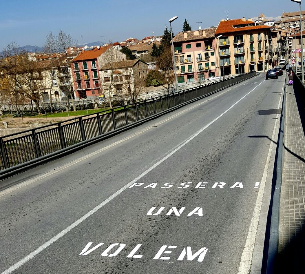 Aquest dimarts al matí han aparegut pintades a la calçada i en algunes façanes del barri de Vista Alegre i a l’entorn del pont, reclamant la passera alternativa per a vehicles i vianants que un sector del veïnat demana.