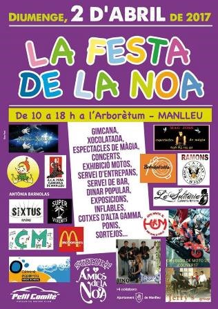 Diumenge dia 2 d’abril Manlleu té una nova oportunitat per demostrar la seva solidaritat amb la Festa de la Noa. Es tracta d'una festa solidària amb l’objectiu de recaptar fons per la millora de vida de la Noa, una nena de 6 anys de Sant Vicenç de Torelló que pateix una malaltia greu.