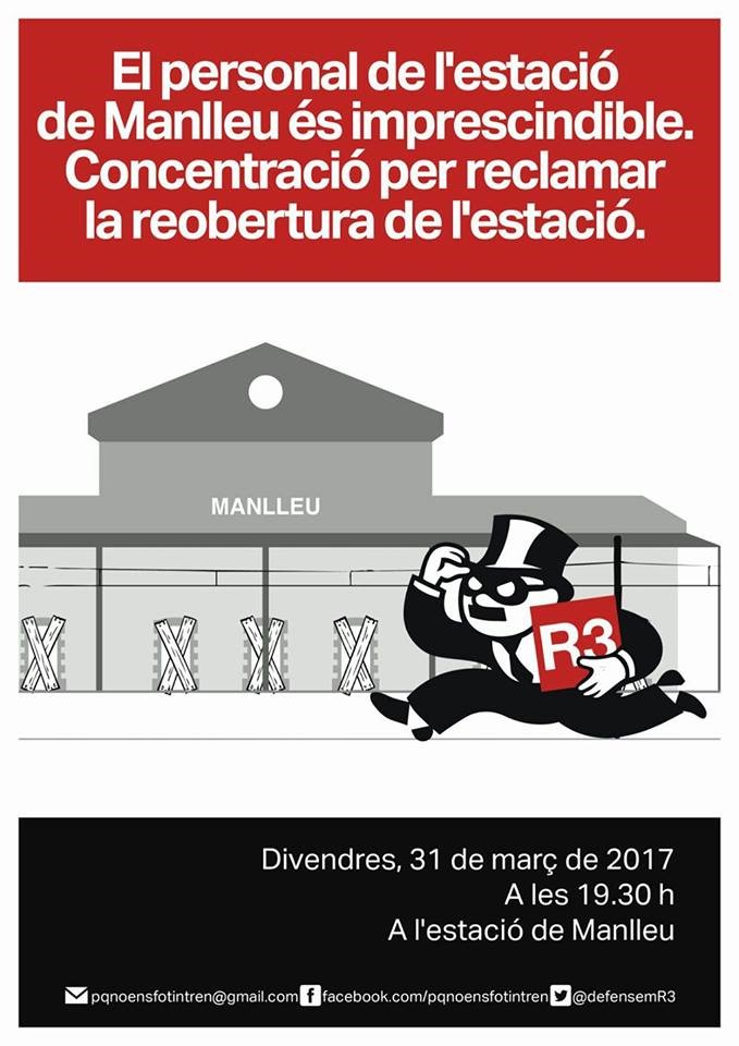 Aquest divendres la plataforma Perquè no ens fotin el tren ha organitzat una protesta davant l’estació de Manlleu. La concentració començarà a 2/4 de 8 del vespre i vol tornar a reivindicar la falta de personal a l’estació de tren.