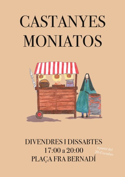 La parada de castanyes i moniatos cuits amb foc de llenya s’establirà a partir d’aquest divendres a la plaça Fra Bernadí i hi serà fins el 2 de desembre. Tot i que el clima i la meteorologia són impropis del mes d’octubre, tornaran a servir-se els productes estrelles de la tardor.