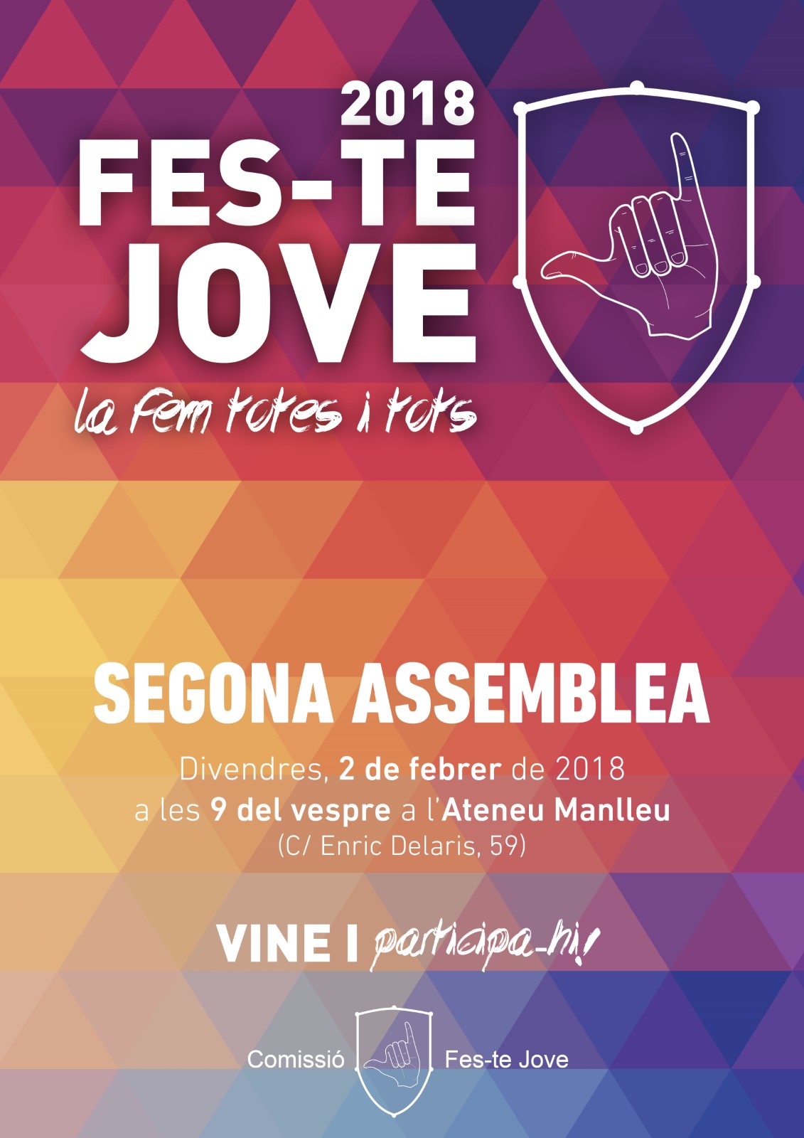 La comissió organitzadora de la Fes-te Jove de Manlleu ha convocat la segona Assemblea aquest divendres a les 9 de la nit a l’Ateneu per seguir la preparació de la celebració del 2018. Conviden al jovent a “aportar idees i nous punts de vista per consolidar i créixer el projecte del jovent manlleuenc”.