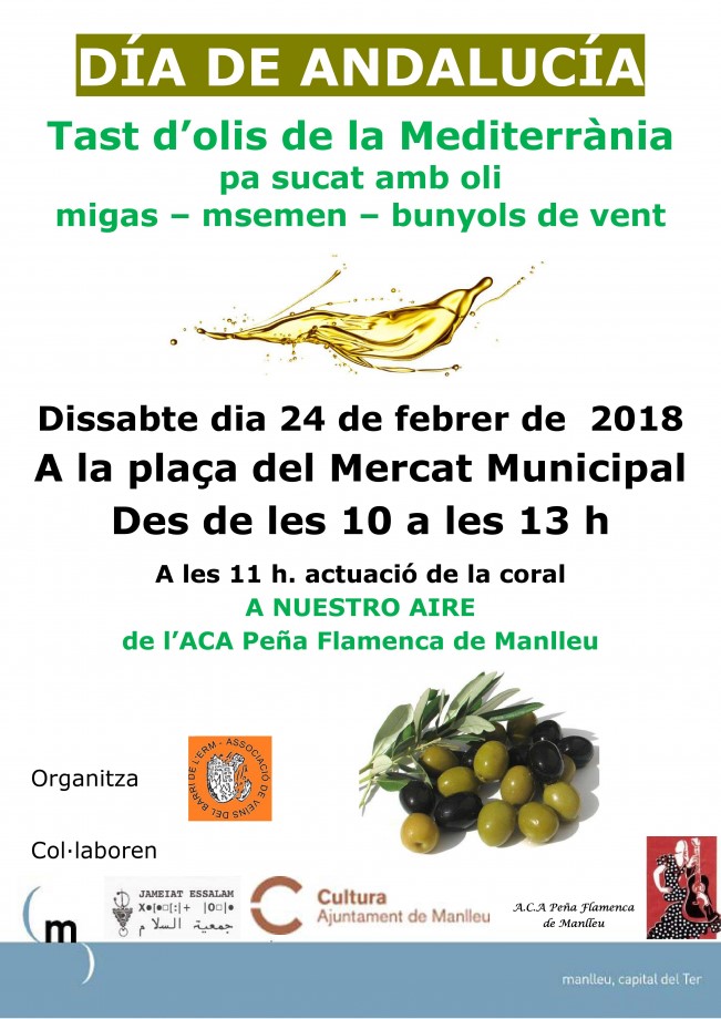 L’Associació de Veïns del barri de l’Erm organitza aquest dissabte a les 10 del matí el Tast d’olis de la Mediterrània. Desplegarà els productes a la Plaça del Mercat i se servirà pa sucat amb oli, migas, msemen i bunyols de vent. L’activitat s’organitza conjuntament amb la Peña Flamenca de Manlleu, que l’inclou dins dels actes de les Festes del Dia d’Andalusia. De fet, després del Tast, a les 11, actuarà el cor de la Peña, “A Nuestro Aire”.