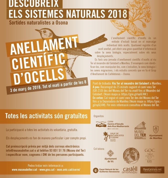 Les activitats són gratuïtes i esdevenen una bona oportunitat per conèixer la fauna i la flora de l’entorn natural de la comarca. És el cinquè any que el Centre d'Estudis dels Rius Mediterranis (CERM), la UVic-UCC, el Museu del Ter, l’Ajuntament de Manlleu i el Grup de Naturalistes d'Osona-ICHN, ho tiren endavant.