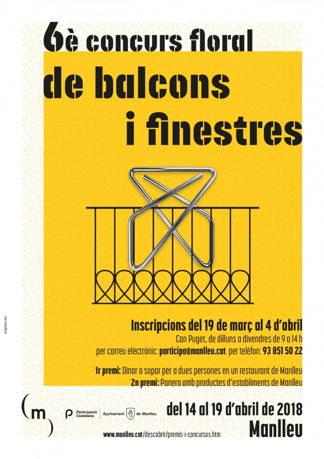 Els ciutadans de Manlleu tenen temps fins aquest dimecres per inscriure’s al 6è concurs floral de balcons i finestres. El guanyador tindrà un dinar o sopar per a dues persones pagat en un restaurant de Manlleu i el segon millor rebrà un lot de productes de diferents establiments de la ciutat. El concurs forma part de les activitats de la Primavera (en)cantada, que se celebrarà del 6 al 29 d’abril.
