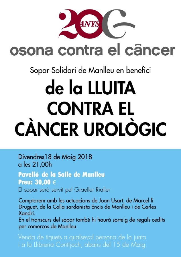 Un sopar solidari per recollir fons en la lluita contra el càncer urològic. És la proposta que fa Osona contra el Càncer per aquest divendres a les 9 de la nit al Pavelló de La Salle. Tindrà un preu de 30 euros, servit pel Graller Rialler, i comptarà amb les actuacions musicals de Joan Usart, Marcel·lí Druguet, la Colla sardanista Encís i de Carles Xandri.