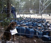 Un gos amb un cartell de ´No a la MAT´ davant les tanques que s´han instal·lat al peu de la torre.