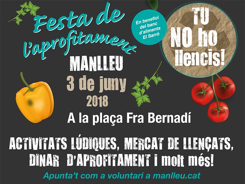 Diàriament es llancen tones de menjar per irresponsabilitat, per inèrcia o per hàbit; sigui perquè es cuina massa i s’acaba escurant a la brossa o directament perquè els productes es fan malbé. Per prendre consciència, Manlleu organitza aquest diumenge, i ja serà el tercer any, la Festa de l’Aprofitament i el Dinar de Llençats.