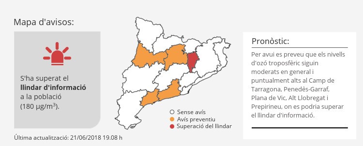 La Plana va superar aquest dijous el llindar d’informació d’ozó troposfèric recomanat per l’Organització Mundial de la Salut (180 μg/m3) que especifica que “no hauria de passar mai al llarg de l’any”. Es van situar a 188 μg/m3 durant dues hores, de 6 a 8 de la tarda, segons el Departament de Territori i Sostenibilitat.