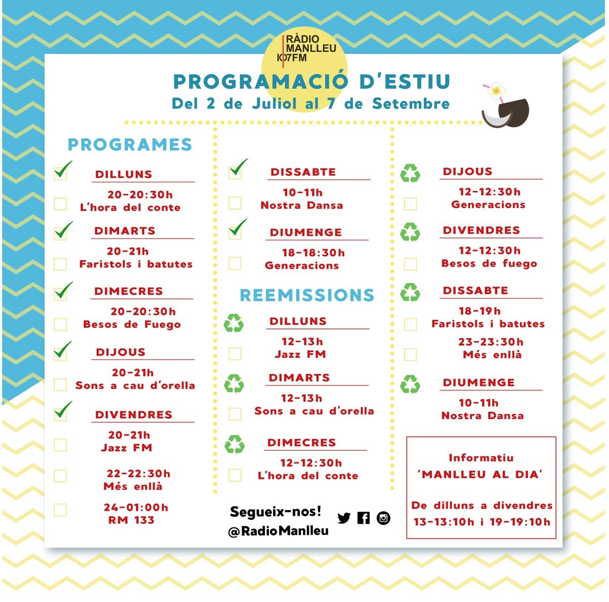 Ràdio Manlleu comença aquesta setmana la temporada d’estiu amb una graella que estarà formada per nou programes, a més de l’informatiu “Manlleu al Dia”, i que es podran escoltar regularment fins la primera setmana de setembre. Almenys cada dia sonarà un programa i també se’n faran reemissions.