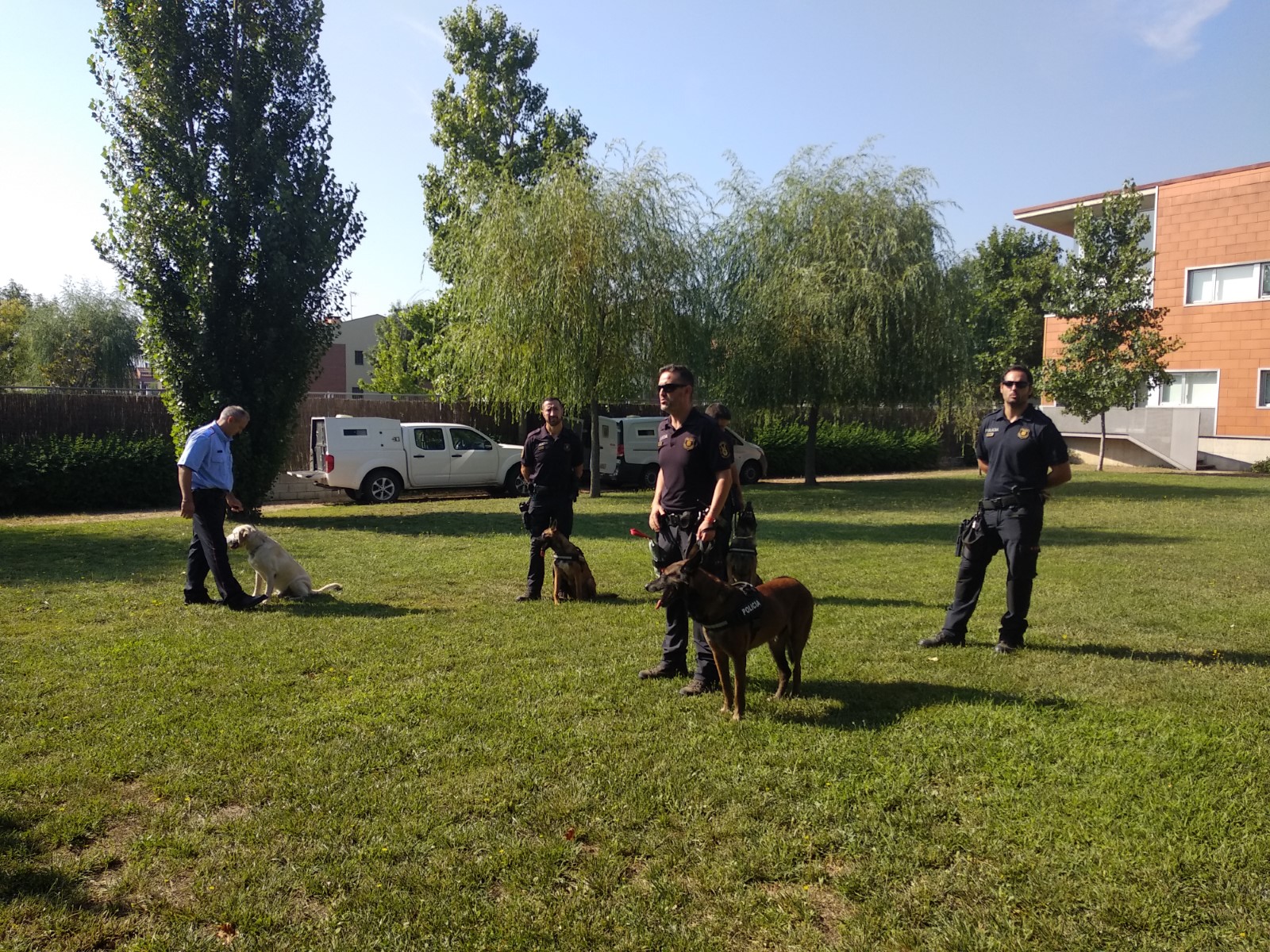 Al jardí de la Llar Residència, els presents van poder veure de primera mà una demostració de com treballen els gossos. Un agent es va amagar entre uns arbustos, la gossa Cala el va trobar sense gaire dificultat i, tal com havia explicat l’agent, es va estar allà fins que hi va arribar el seu guia-amo, el qual la va obsequiar amb un “xurro” (una joguina). Segons explicava el mateix agent, “qualsevol dels nostres gossos ha de ser molt juganer i molt actiu. Per nosaltres la tasca que fan és molt important, però per ells no deixa de ser un joc”.