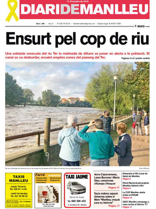 Aquesta és la portada de l'edició d'avui dimecres, 17 d'octubre, del Diari de Manlleu. La pujada del cabal del riu Ter, protagonista.
