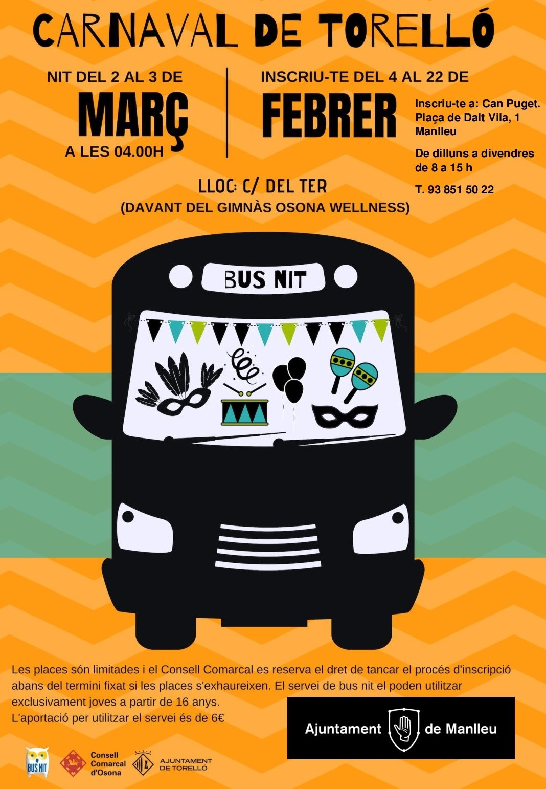 La pròxima nit del 2 al 3 de març se celebra a Torelló el popular Carnaval de Terra Endins, que aplega al poble de la Vall del Ges milers de persones d’arreu de la comarca i de Catalunya. No hi faltaran els manlleuencs i manlleuenques, que tindran a la seva disposició un autobús per tornar cap a Manlleu de matinada.