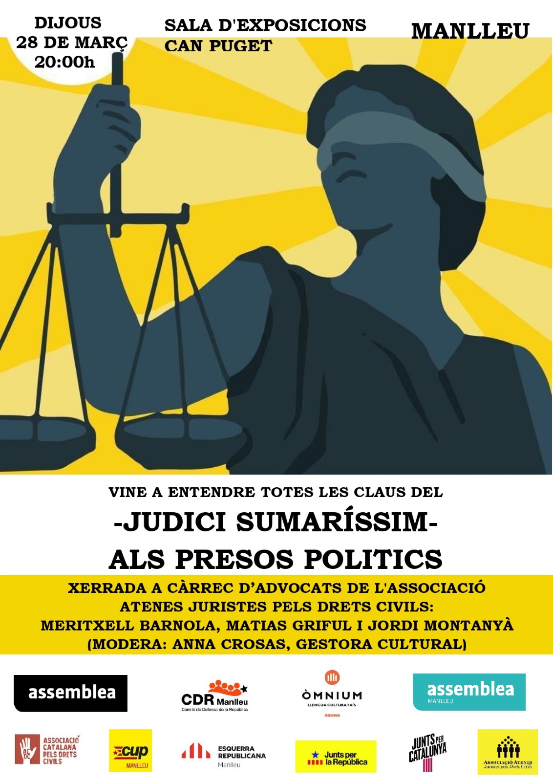 L’Assemblea Nacional Catalana de Manlleu organitza per aquest pròxim dijous, 28 de març, una xerrada a càrrec d’advocats de l’Associació Atenes Juristes pels Drets Civils que pretén fer entendre a tots els assistents i les assistentes les claus del “Judici Sumaríssim als presos polítics” que s’està duent a terme al Tribunal Suprem.